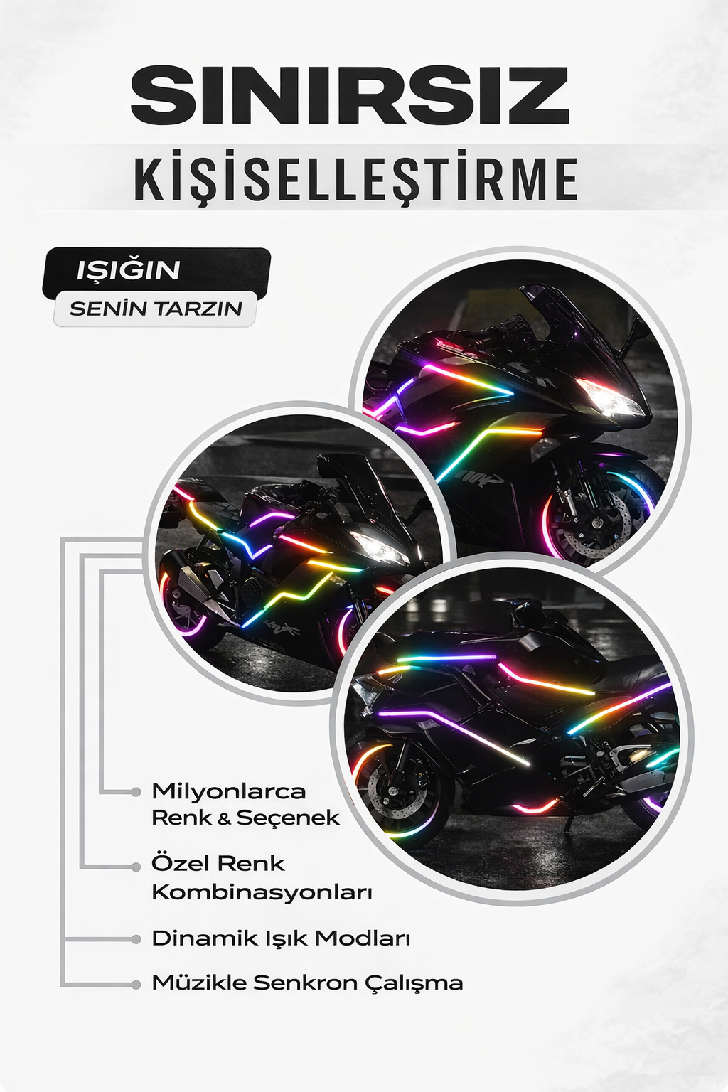 MotoZone Aura, motosikletler için geliştirilmiş RGBIC ambiyans aydınlatma sistemidir.Uygulama ve uzaktan kumanda ile renkler, efektler ve müzik senkronu kolayca kontrol edilir.Premium yapısı, yüksek kullanıcı puanı ve 30 gün koşulsuz iade avantajıyla güvenli bir deneyim sunar.